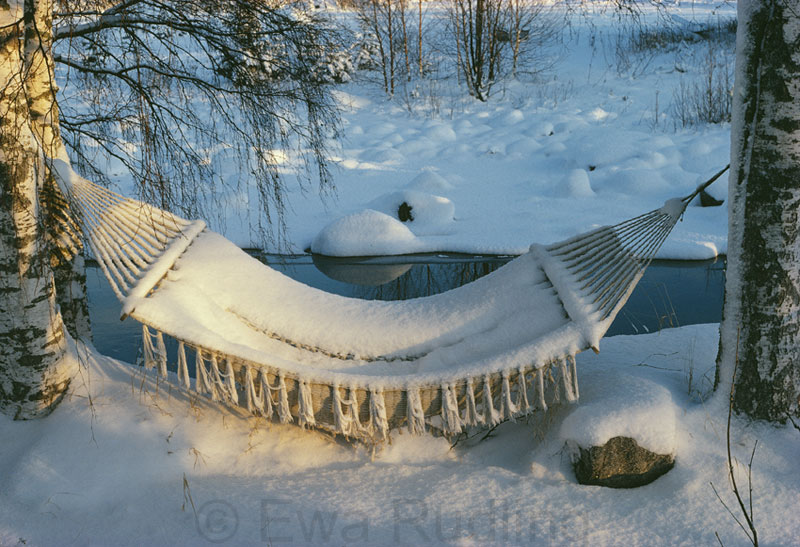 The shot of the hammock covered in snow, is sublime